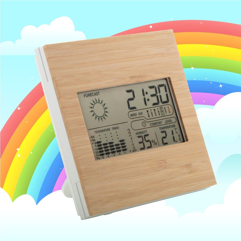 Stazione meteorologica e orologio digitale con pannello frontale in bambù.
